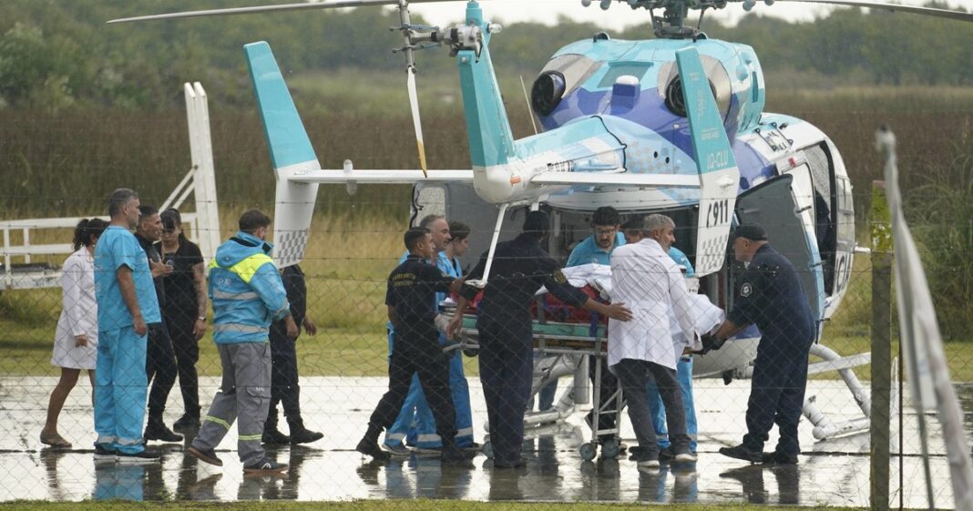 A las 16.32 salió del Hospital de Pinamar bajo una lluvia intensa, cerrada, que caía sin tregua. La ambulancia avanzó despacio, escoltada por patrulleros y motos de la policía bonaerense, en un recorrido corto pero cargado de tensión hasta el destacamento de dicha fuerza donde funciona el helipuerto, frente a la estación Divisadero.